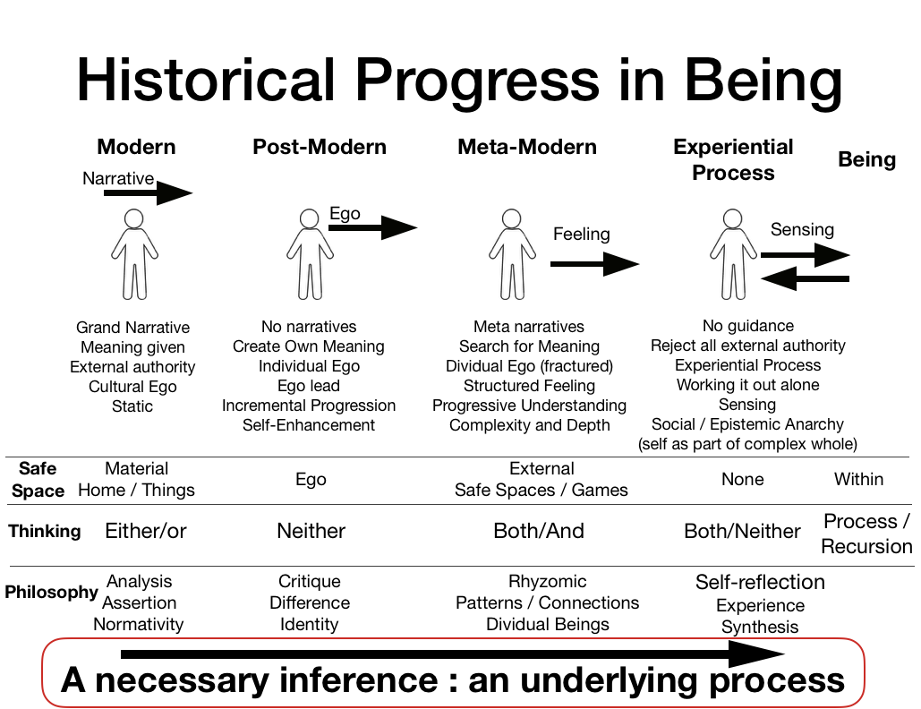 Millennials - a generation have grown up without guidance within complexity; shamed and brutalised by mutually contradictory, partial modern perspectives. Uncertainty, chaos, and epistemic anarchy was your training ground. Your whole lives have been the struggle between ideologies, and an emergent process of inquiry; a living process towards becoming more complex and self-aware; decentralised dividuals made of different parts, decentralised epistemic authorities unto yourself, more embodied and self-aware. A generational parallel process of inquiry.